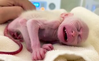 In the deepest corner of the green forest, where tall trees touched the sky and soft sunlight slipped through the leaves, a poorest skinny newborn baby monkey lay trembling on …